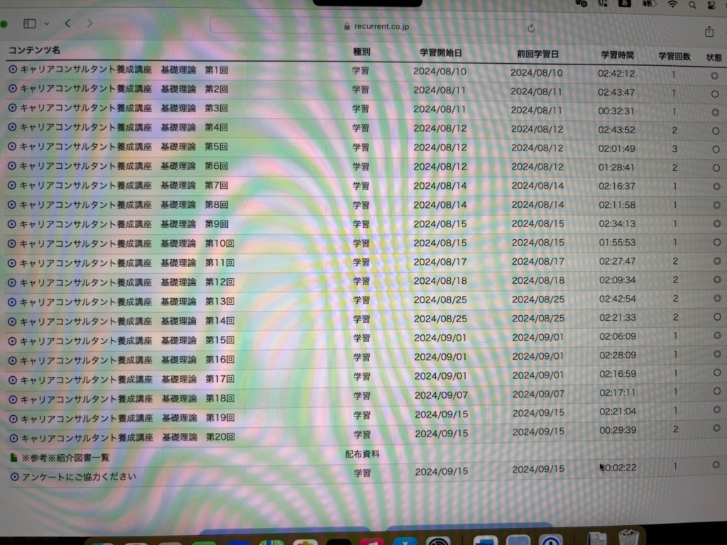 1ヶ月ちょい、延べ11日、約50時間の学習が終了しました。なかなか、興味深い内容で比較的楽しく受講出来ましたが、試験までには暗記が必要になるのでちょっと大変です。💦